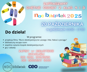 Biblioteka szkolna zaprasza chętnych uczniów z klas 4 do udziału w 11 edycji ogólnopolskiej akcji NOC BIBLIOTEK. W tym roku odbywa się ona pod hasłem: „Do dzieła!”