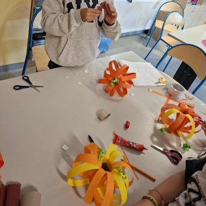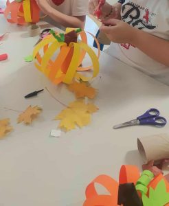 Po części kulinarnej przyszedł czas na działania plastyczne. Z kolorowego papieru powstały przepiękne, jesienne dynie – każda inna, każda wyjątkowa. Uczestnicy z zaangażowaniem i radością tworzyli swoje prace, rozwijając kreatywność i zdolności manualne, dzięki pomysłowości Pani Anny Nowowsiak i Pani Anny Wietrzyńskiej.