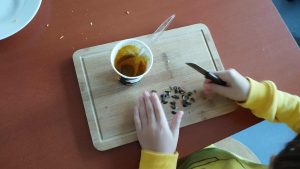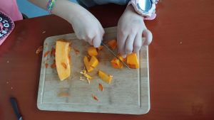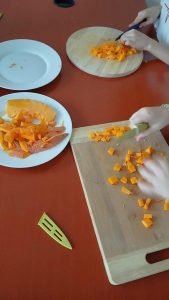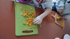 Na początku warsztatów uczestnicy mieli okazję poznać dynię z bliska – zobaczyć, jak wygląda w środku, obejrzeć pestki i przekonać się, że to warzywo kryje w sobie wiele ciekawych tajemnic. Pod czujnym okiem Pani Martyny Malewicz i Pani Agnieszki Mrozińskiej-Nowak uczniowie wspólnie kroili kawałki dyni oraz przygotowywali składniki potrzebne do ugotowania pysznej zupy krem z dyni i cukinii.