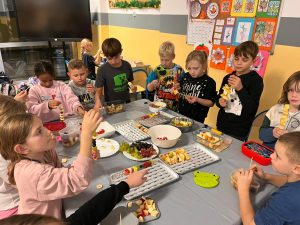 Dzieci z wielkim zaangażowaniem wybierały swoje ulubione owoce i warzywa, układały na patyczkach tworząc prawdziwe dzieła sztuki kulinarnej. Wśród składników znalazły się m.in. winogrono, jabłko, kiwi, borówka, banan, marchewka, ogórek, papryka – wszystko świeże, kolorowe i przede wszystkim zdrowe. Chętnie zajadały przygotowane owocowo-warzywne smakołyki.