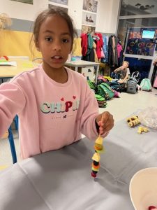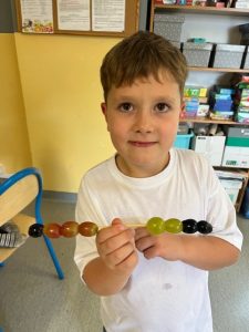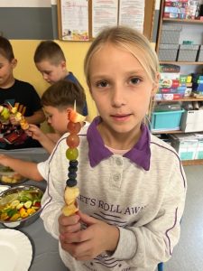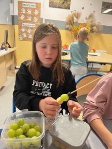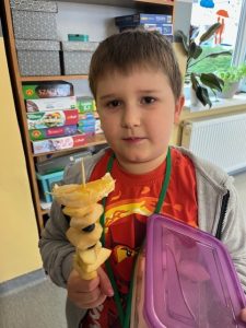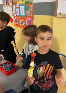 Dzieci z wielkim zaangażowaniem wybierały swoje ulubione owoce i warzywa, układały na patyczkach tworząc prawdziwe dzieła sztuki kulinarnej. Wśród składników znalazły się m.in. winogrono, jabłko, kiwi, borówka, banan, marchewka, ogórek, papryka – wszystko świeże, kolorowe i przede wszystkim zdrowe. Chętnie zajadały przygotowane owocowo-warzywne smakołyki.