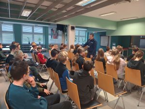 W ramach realizacji zadań programu profilaktyczno-wychowawczego uczniowie klas siódmych uczestniczyli w lekcji profilaktycznej z policjantem.