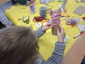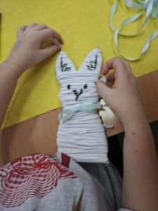 Następnie zabraliśmy się za tworzenie przestrzennych zajączków. W ruch poszły szablony, nożyczki i miękka włóczka, z której krok po kroku powstawały wyjątkowe figurki. Dzieci z zaangażowaniem owijały swoje zające, dodając im oczy i ogonki. Zadanie to wymagało precyzji i cierpliwości, a jednocześnie pozwalało na twórczą interpretację.